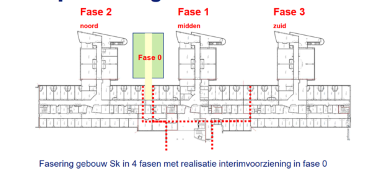The renovation project of building Sk consists of three phases, preceded by a preparatory phase 0. In this phase, a temporary building will be set up for 32 MC beds and departments will be relocated.