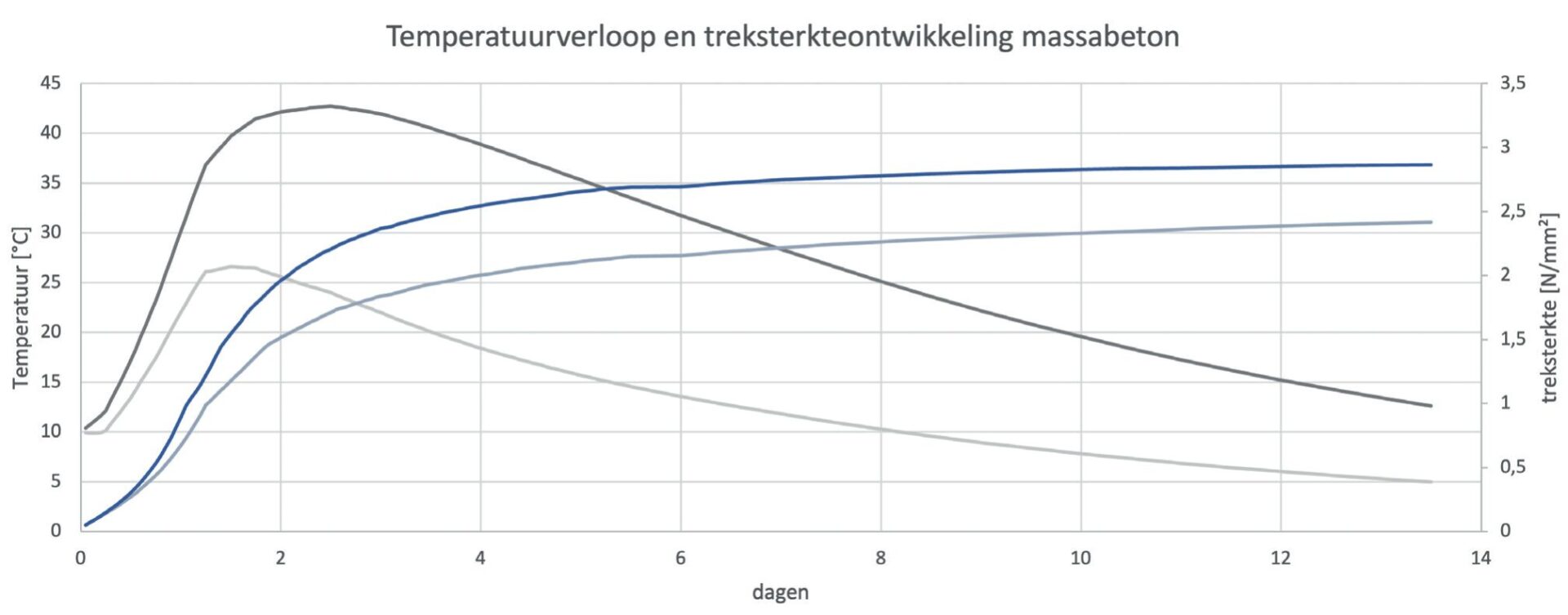 Dit effect kun je vergelijken met een te bakken cake. Cake warmt op als het deeg nog zacht is en neemt toe in volume. Eenmaal uit de oven koelt de buitenkant snel af en wil krimpen, terwijl de binnenkant warm blijft en niet wil krimpen. Hierdoor kan de cake scheuren. Bij beton, zeker in massabetonconstructies, werkt het net zo: de chemische reactie tijdens het verharden veroorzaakt warmte. Omdat de buitenkant sneller afkoelt, ontstaan forse temperatuurverschillen met de kern. Dit zorgt voor spanningsopbouw en kan leiden tot scheuren. De mate waarin hangt af van diverse factoren: betonsamenstelling, omgevingstemperatuur, bekistingstype, ontkistingsmoment en nabehandeling.