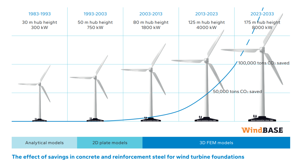 In de loop der jaren zijn de afmetingen en vermogens van windturbines enorm toegenomen. Datzelfde geldt voor de belastingen die turbines via de fundering naar de ondergrond moeten afvoeren. Het ontwerpen van de funderingen is dan ook blijvend in ontwikkeling en groeit met de omvang van de windturbines mee.