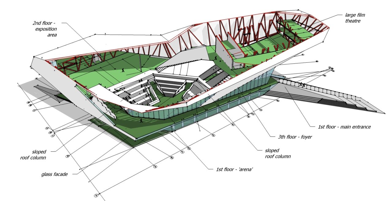 De rest van de constructie is ‘verstopt’ in gesloten gevelvlakken. Dit was geen eenvoudige oplossing, omdat deze vlakken slechts op enkele plekken het maaiveld daadwerkelijk raakten. Bij dit gebouw is een hybride constructie toegepast. Hierdoor voldoet het gebouw aan de wens om een licht gebouw met een stempelloze uitvoering te zijn. Daarnaast voldoet het gebouw aan de strenge akoestische eisen.