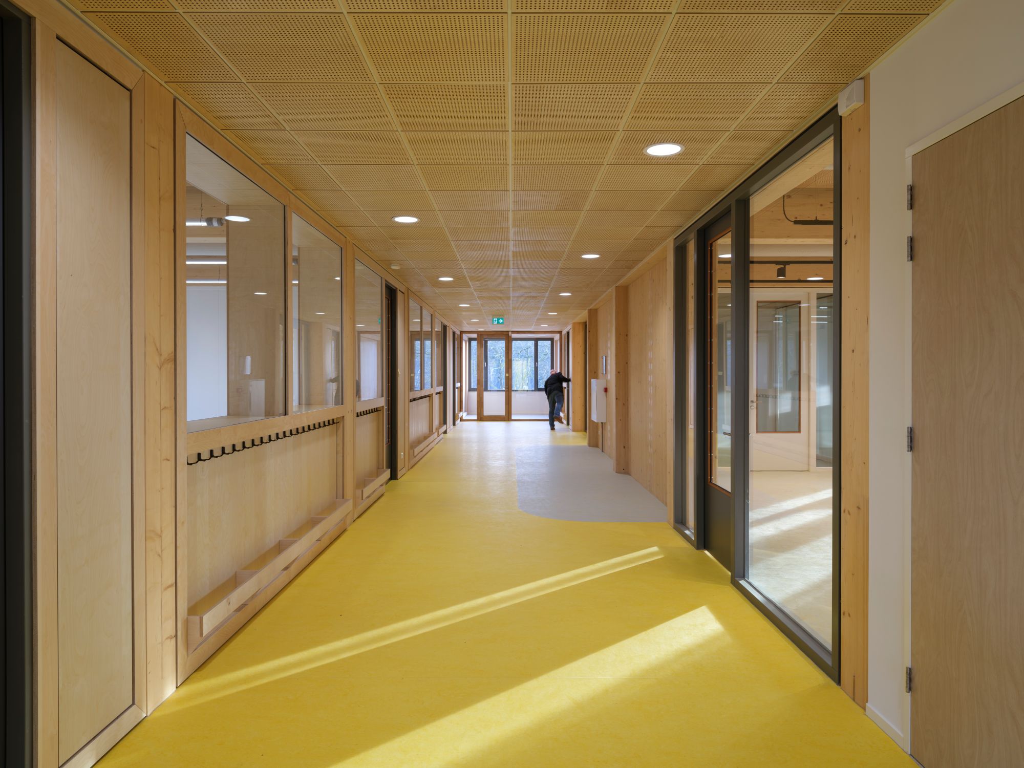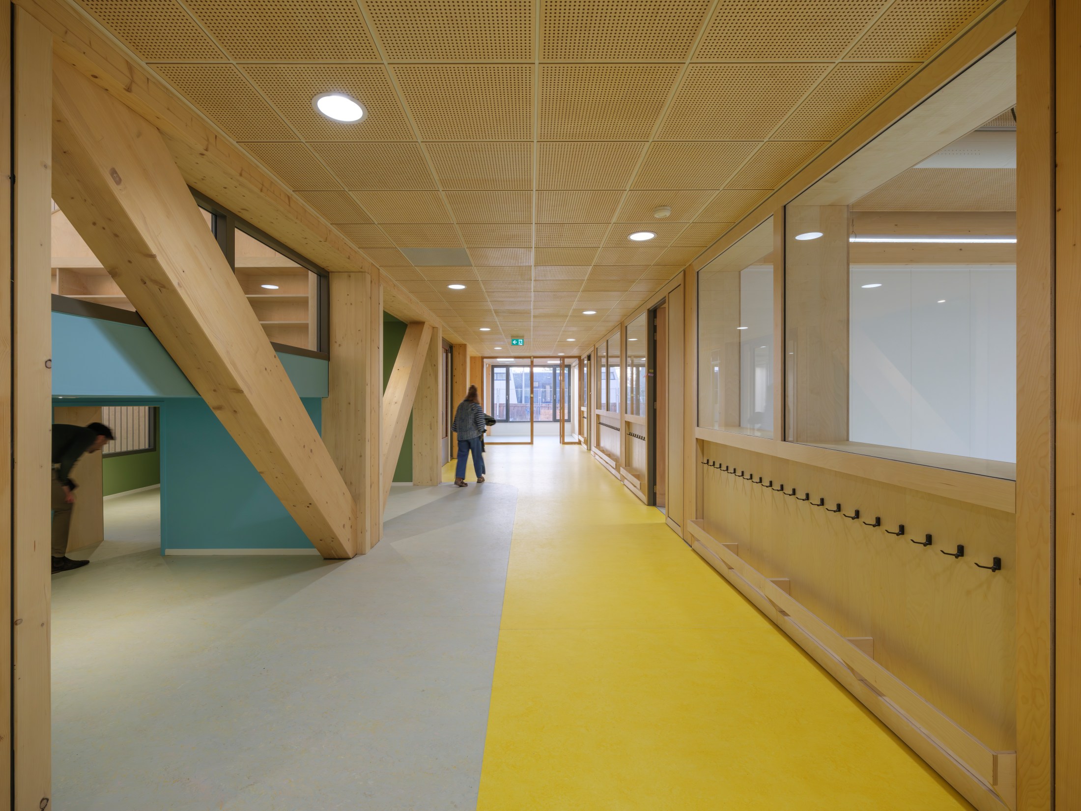 De modulaire scheidingswanden maken het mogelijk om de klaslokalen en gangen te configureren. Ze kunnen worden aangepast aan verschillende doeleinden: grote kastwanden, kluisjes of opslagruimte, kapstokken, of met groen beplante wanden. Ook kunnen ze worden ingezet als tentoonstellingswanden om het werk van leerlingen te presenteren en de identiteit van de school te versterken. De flexibele technische backbone is uit het zicht boven de plafonds in de gangzones geplaatst. Naarmate de school ontwikkelt, kunnen er meer klaslokalen worden toegevoegd door de bestaande noordelijke gevel te verwijderen en het modulaire structurele raamwerk hier uit te breiden.